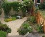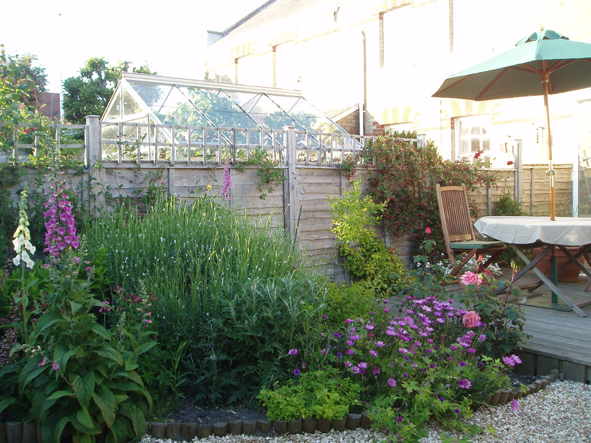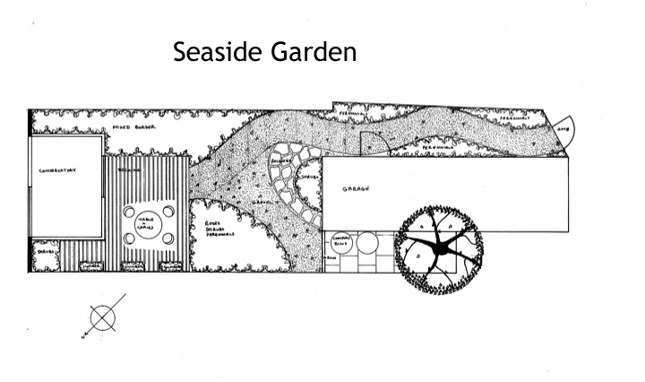 This is a holiday cottage garden so is designed for low maintenance. Plants have been chosen that are tolerant of the site conditions and have relatively low maintenance needs. Climbers and wall plants hide the fences and are being trained over the garage. Scented plants surround the decked seating area.